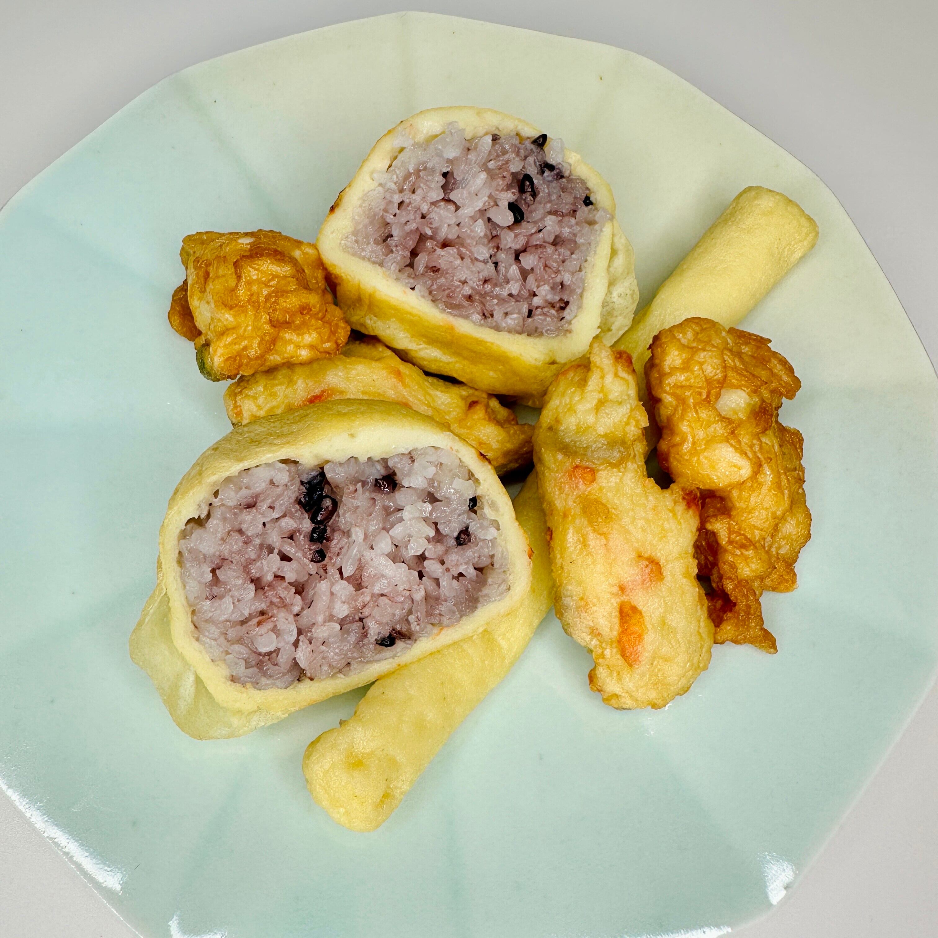 黒米のおにぎりをかまぼこ(さつま揚げ)で包んだだけなのに、なんだかクセになる美味しさです。